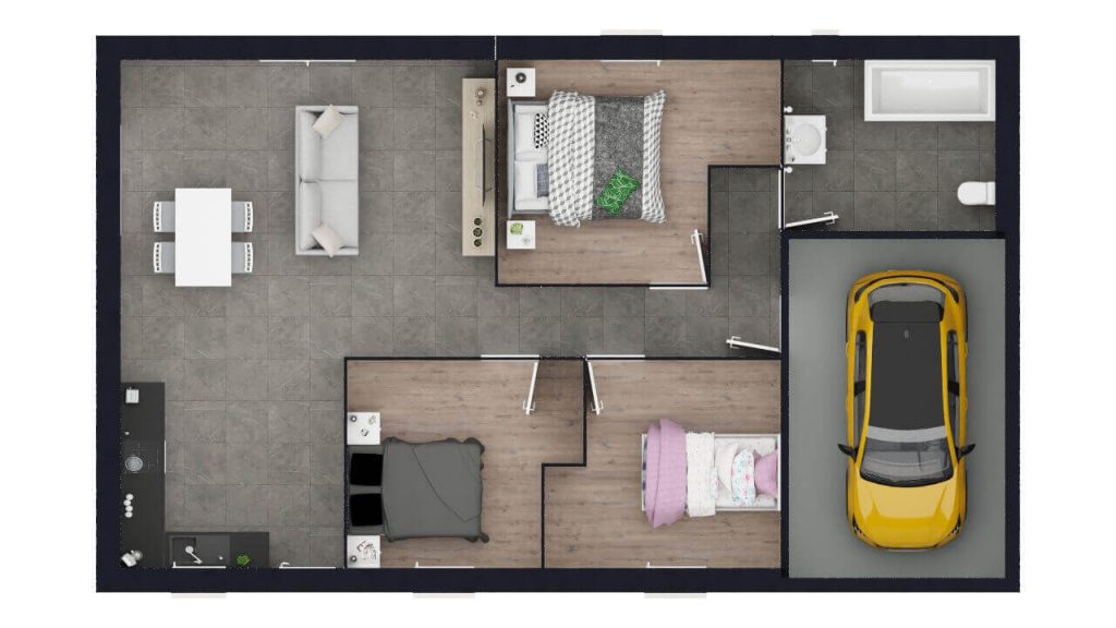Maison plain-pied neuve à construire de 75 m², à budget maîtrisé et accessible pour tous.